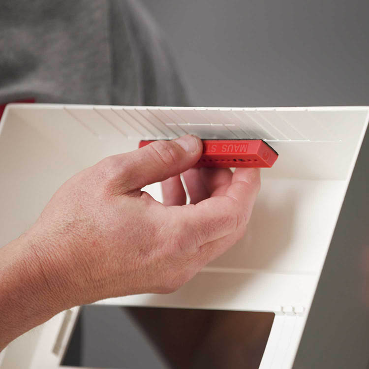 MAUS Stixx Pro har en selvklæbende bagside og monteres direkte i det rum, der skal beskyttes. Den kompakte størrelse på 9,8 x 1 x 1,8 cm gør, at den nemt kan placeres selv i trange rum, hvor traditionelle brandsikringsløsninger ikke kan være. Den fungerer helt fritstående og kræver hverken strømforsyning, tryksatte beholdere eller kabeltrækning.