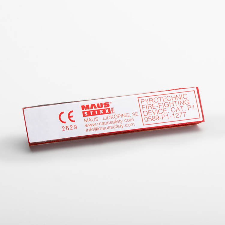 MAUS Stixx Pro er en svensk innovation med både designbeskyttelse og patent samt globalt varemærkebeskyttelse. Den unikke konstruktion og den patenterede slukningsteknik adskiller produktet fra traditionelle brandslukkere og sikrer en gennemtænkt og gennemprøvet løsning. Produktet er desuden certificeret i henhold til BAM og CE, hvilket betyder, at det lever op til relevante sikkerheds- og kvalitetskrav i EU.Specifikationer