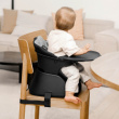 Højstolen monteres hurtigt og nemt på de fleste almindelige spisebordsstole, hvilket gør den til et praktisk alternativ til pladskrævende højstole. Med stropper, der trækkes under og rundt om stolens ryg, sidder den godt fast. Barnet sidder i en ergonomisk højde og kan nemt sætte sig til bords og dele måltidet med resten af familien.Innovativt design