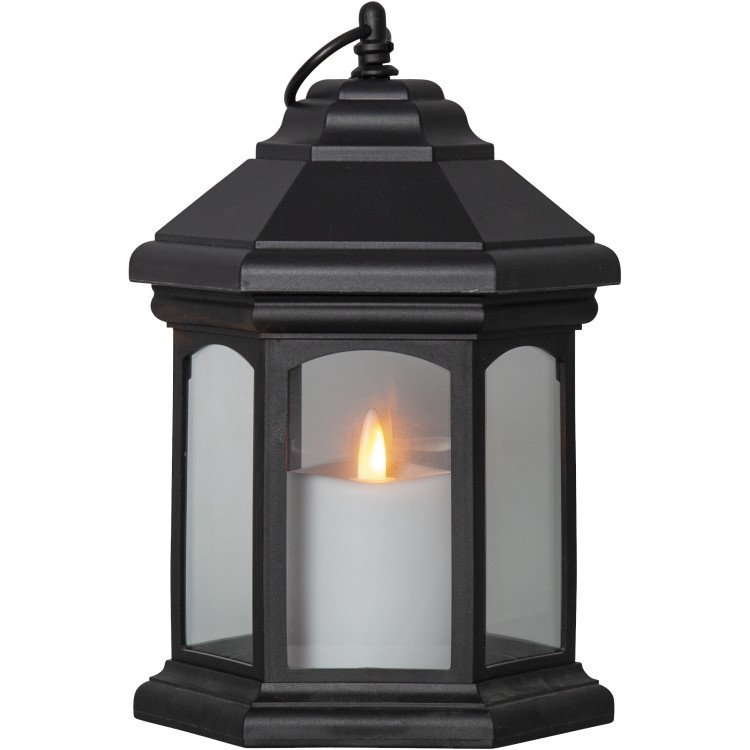 Den energibesparende LED-lampe har 18 dioder. Diodernes pulserende lys giver en naturlig og realistisk flamme, der lyser med et varm hvid skær gennem lanternens gennemsigtige vindue.Lanterne til have, altan og terrasse