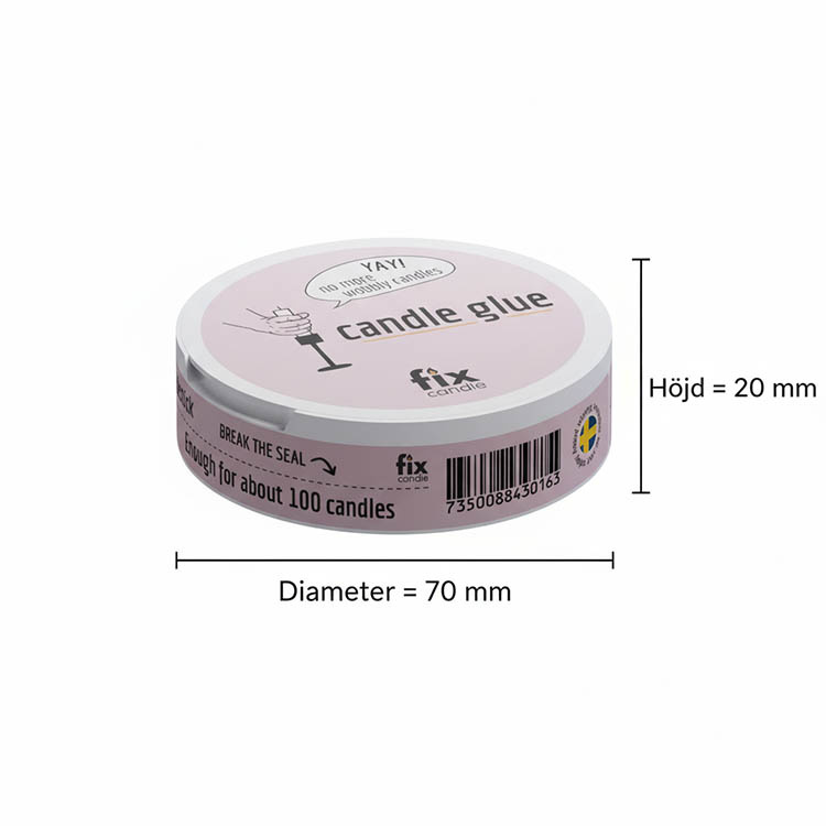 FixCandle er klister til stearinlys, der muliggør helt nye indretningsmuligheder og giver dig frihed til at skabe nye innovative lysestager i hjemmet. Med et stykke klister på størrelse med et stearinlys i bunden af et lys kan du sætte lyset fast på nye typer overflader, såsom sten, marmor, stål, glas og fliser og lyset står så solidt og behøver ikke en lysestage at stå i. Det, der gør dette klister endnu mere unik, er, at du kan fjerne og flytte både lyset og klæbemidlet, når du vil genbruge det til den næste placering.