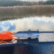 Bind bjærgelinen fast til linehajen, placer linehajen over den spændte fiskeline, og lad linehajen falde ned i vandet. Hold fiskelinen stram, indtil linehajen har fulgt fiskelinen helt ned til fiskelinen. Den indre rille på linehajen fører den langs fiskeline.