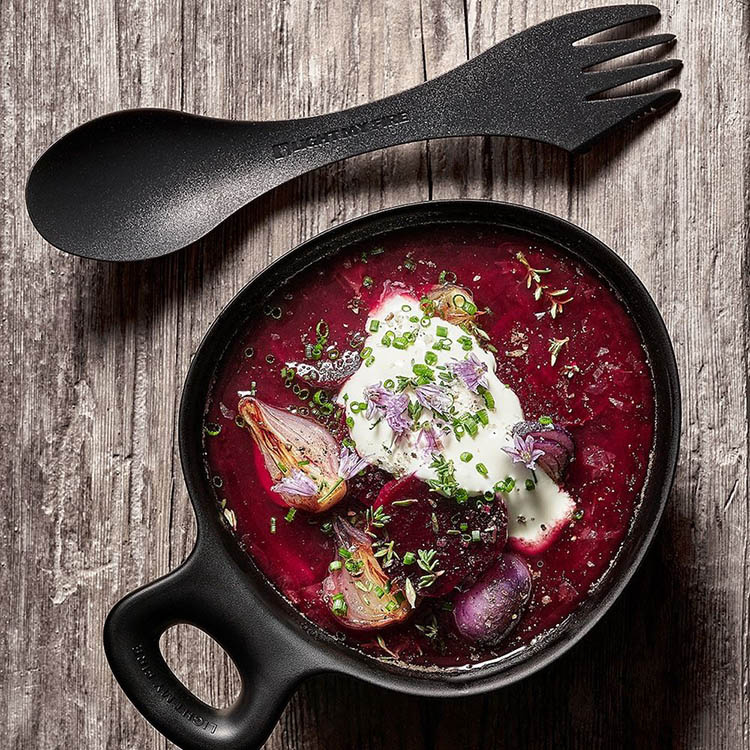 Hver del af frokostsættet har flere gennemtænkte funktioner, der gør det nemmere at lave mad og spise måltider udendørs. For eksempel har den mindre skål og kruset målemarkeringer på siden. Madkassen har en spork-holder på siden, og skærebrættet kan bruges som en lille si til at si kartoffel- eller pastavand i.Komplet måltidssætt