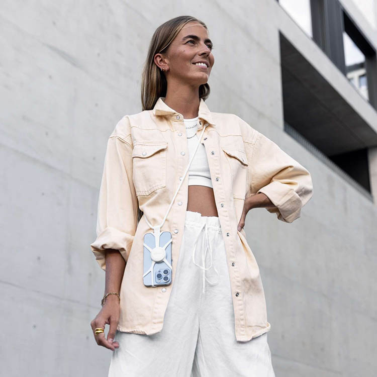 Den justerbare nylonsnor kan nemt justeres, så telefonen hænger behageligt om halsen eller over skulderen. Den lange nylonsnor er 150 cm lang og kan også bæres over tykkere vintertøj.