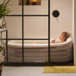 Det oppustelige badekar er blødt at sidde i, og kanten er behagelig at læne hovedet mod. Badekarret har en drikkevareholder på siden og et aftageligt varmeskjold, der holder vandet varmt og også fungerer som en afskærmning.