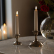 Det korte antikke stearinlys drives af 2 AAA-batterier (medfølger ikke), og den patenterede, energibesparende LED-flamme giver over 120 timers brændetid. Lyset er 15 cm højt (inklusive flammen), ca.2 cm bredt og passer til de fleste lysestager.