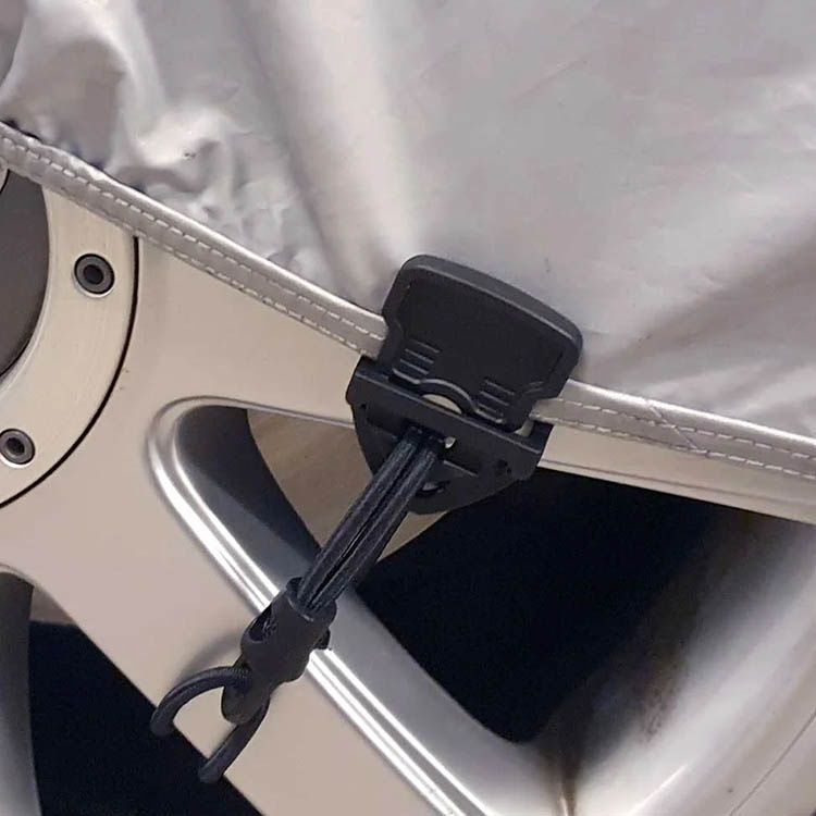 Når presenningen spændes, trækker klemmen sig sammen, og den riflede del klemmer sig ind i presenningen, så den ikke kan løsne sig. Når du ikke længere har brug for presenningen, kan klemmen tages af, flyttes og genbruges på en anden presenning.