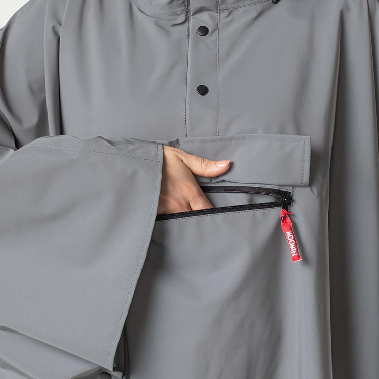 Trykknapper ved halsåbningen gør det nemt at tage ponchoen på og giver en bedre pasform. Der er også trykknapper langs siderne for at holde ponchoen på plads og forhindre, at den blafrer i vinden under turen.Integreret opbevaringspose