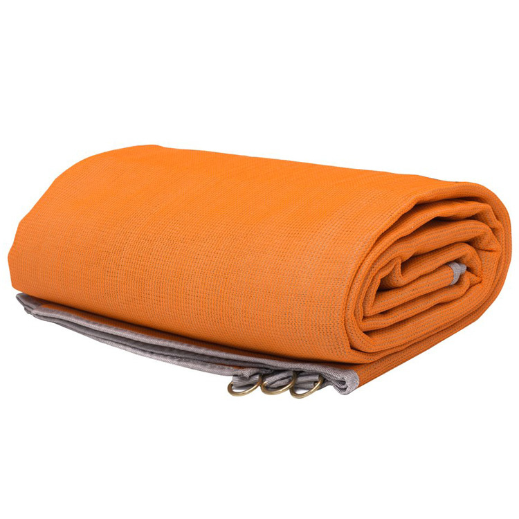 Den store campingmåtte er UV-bestandig og absorberer ikke vand. De robuste fletningsringe i hjørnerne gør det også muligt at stabilisere måtten yderligere i jorden for en mere permanent installation.