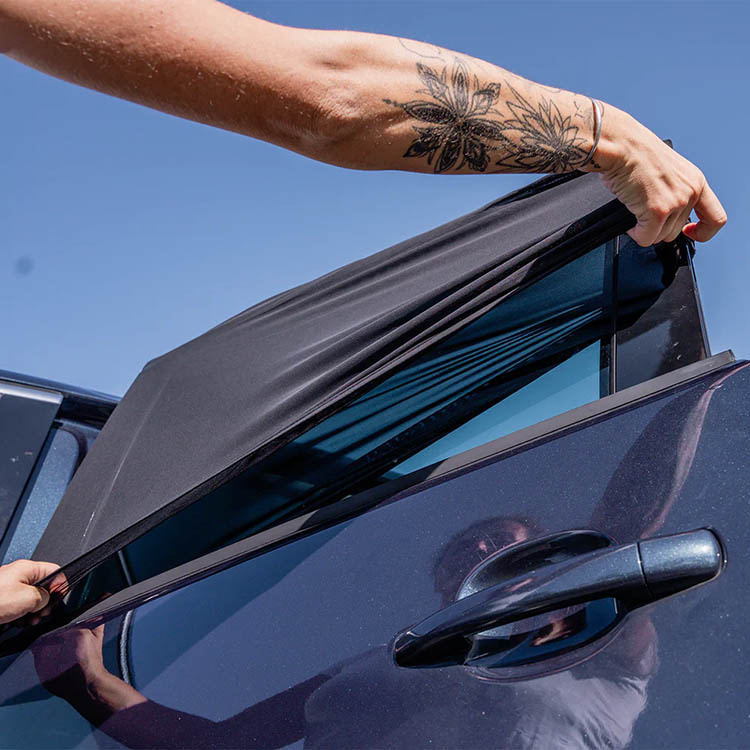 Solbeskyttelsen er fremstillet i et strækbart og perforeret stof som nemt trækkes over bilens dør. Det betyder at du ikke behøver nogen værktøjer eller sugekopper - den sidder på plads af sig selv takket være den elastiske pasform.Specifikationer