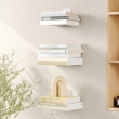Den nederste bogs, nederste omslag, lægges i en fastgørelse i bunden af hyldebagsiden, så selve hylden er skjult. Takket være dette smarte og stilrene design er reolen med bøger på slet ikke synlig, hvilket giver en illusion af svævende bøger.